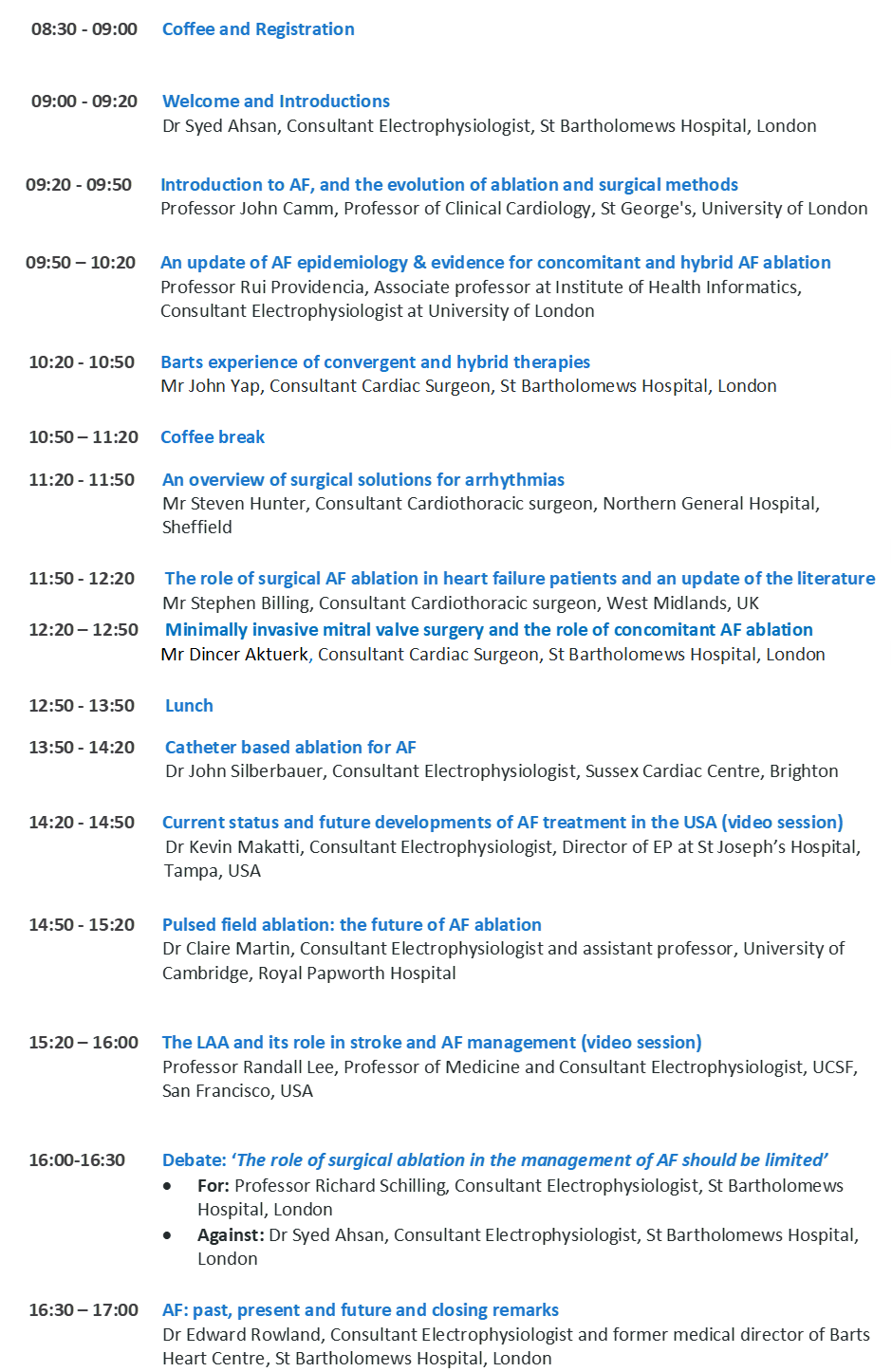 Barts Hart Centre is holding its first hybrid ablation training day. Registration is open to reserve your attendance at this complimentary event at St Pauls Cathedral. Distinguished experts will share insights on the latest technologies and techniques for managing AFib through surgical, ablation and hybrid techniques. The program features informative lectures and panel discussions that encourage direct interaction between the faculty and participants. An audience of cardiologists and cardiac surgeons along with some allied health professionals are expected.