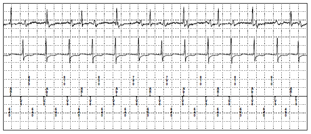 Figure 2 – Ventricular Sensing Episode showing true Ventricular Tachycardia; Channels top to bottom include near-field atrial EGM, near-field ventricular EGM and marker channel
