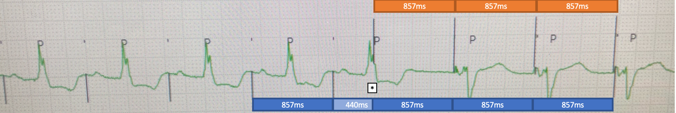 The epicardial device was found to be at ERI and had consequently mode switched to VVI 70bpm with unipolar pacing (5V@1ms). As well as VA conduction, inter-pacemaker crosstalk can explain the higher sensed atrial rate seen in Figure 1 (Bardia et al. 2022). The epicardial device was reprogrammed to VVI 30bpm with cessation of ventricular pacing. The patient was then admitted for their epicardial device to be explanted.
