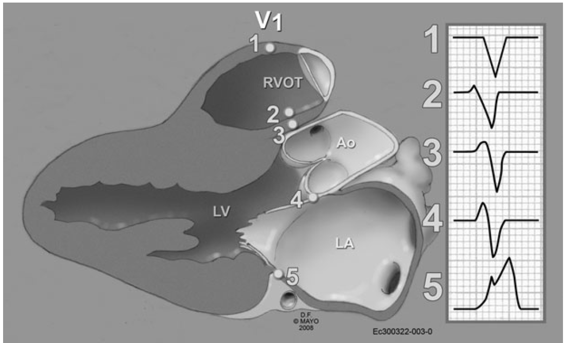 If the PVC is originating from the RVOT it is likely to have a LBBB pattern and an inferior axis (positive QRS in inferior leads). There may be a small R waves present in V1 if the origin of the ectopic is from the posterior RVOT. There will also be small R waves present in the left and Right coronary cusps. The R waves in the left coronary cusp is smaller than one would assume as there is very little myocardium adjacent to this structure to generate a large R wave. Complexes originating from the aortomitral continuity have a dominant R wave in V1 and RBBB pattern.(1) If the precordial transition is later than in sinus rhythm The PVC is likely to be RVOT. If the pre cordial transition earlier than in sinus rhythm then likely to be LVOT(2)