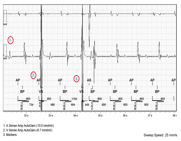 Whilst having no severe clinical impact in this case, there have been reported case studies of device-initiated arrhythmia caused as a direct result of pseudopseudo fusion. An example of such a case is when a PVC falls into the post atrial ventricular blanking (PAVB) period and is therefore not sensed. As a result, a ventricular pace is delivered at the end of the programmed AV delay which coincides with the vulnerable period of the cardiac cycle resulting in the initiation of polymorphic VT/ VF (Do et al., 2021).