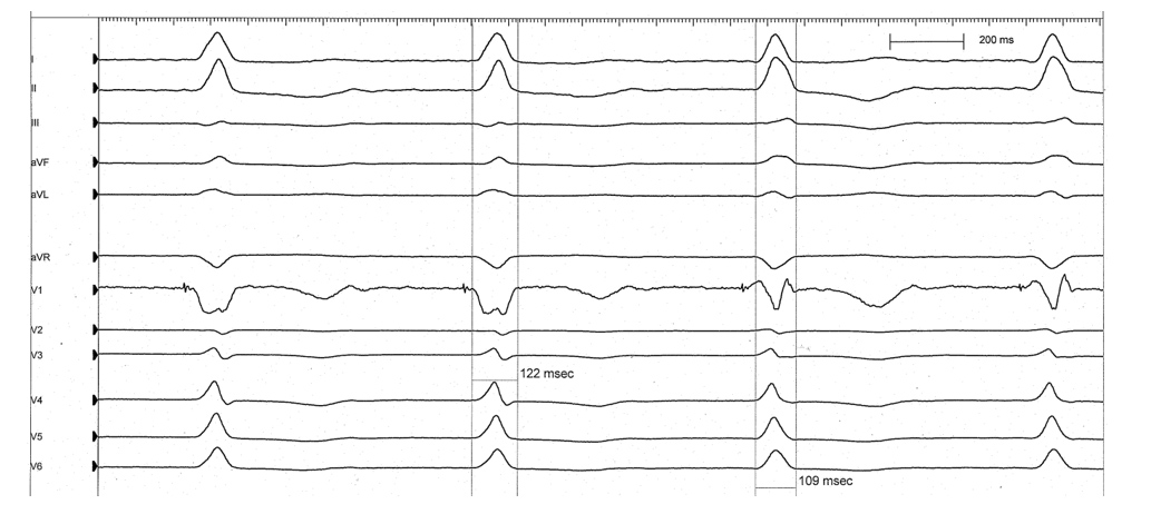 Figure 2. ECG of the QRS morphology change at a sweep speed of 100 mm/s
