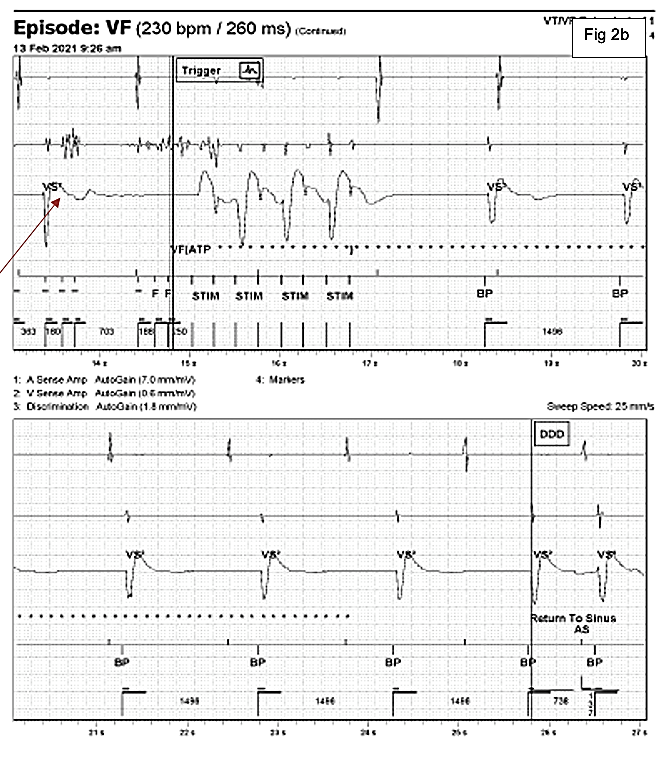 Noise detected on the RV near field sensing circuit, is subsequently sensed and binned as VF (marked as an F and counted towards intervals to detection). At the point of detection (in this case 12 binned VF intervals), the Secure Sense RV Lead noise algorithm (designed to detect RV lead noise) was not applied as it had switched to passive function, due to a lack of sensing on the far-field channel. This is indicated on the trace by a single VS2 (shown by arrow in Figure 2b) marker during the detection period. The device perceives this single sensed beat as indicative of poor or inaccurate far-field sensing and therefore switches to passive. This is to reduce the chance of withholding therapy for a genuine ventricular arrhythmia. Therefore, the noise is detected as VF and results in delivery of inappropriate ATP and an aborted shock.
