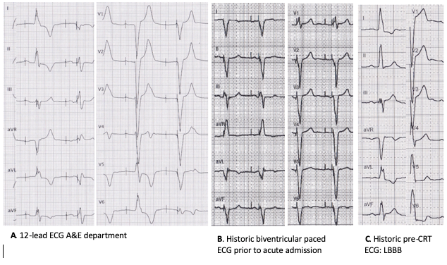 The phenomenon termed “fusion” occurs when a pacing stimulus collides with an intrinsic impulse and both contribute to the myocardial depolarisation resulting in a fused morphology on the surface ECG. In certain CRT patients this may be intentional as it has been associated with improved cardiac remodelling.4 “Pseudo-fusion” refers to a pacing spike falling on top of an intrinsic impulse without capture and no contribution to the depolarisation. The morphology is the one of an intrinsic beat only. “Pseudo-pseudo-fusion” (not shown on this ECG) would describe an atrial paced stimulus coinciding with an intrinsic QRS (rather than a ventricular stimulus).