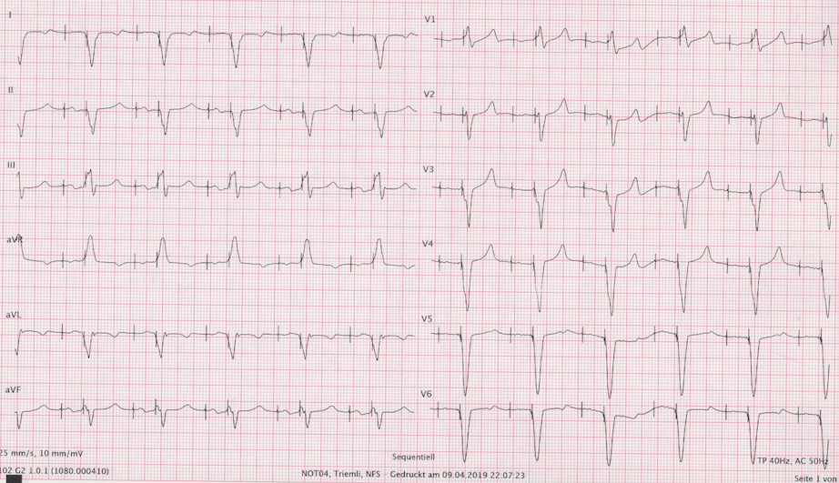 The patient was diagnosed with severe hyperkalemia, with a potassium of 8.6mmol/l in the context of acute-on-chronic kidney insufficiency likely precipitated by a urinary tract infection, suspected gastroenterological bleed and concomitant treatment with a mineralcorticoid receptor antagonist, angiotensin receptor-neprilysin inhibitor and metformin. The patient was urgently treated with intravenous calcium gluconate 10% for membrane stabilization as well as Insulin-Glucose Infusion and nebulised Salbutamol for redistribution. Aldactone, Sacubitril-Valsartan and Metformin were hold. A repeat potassium measurement showed successful reduction to 6mmol/l and a follow up ECG three hours later confirmed appropriate atrial and ventricular capture and reversal of the T Wave inversion (Figure 4).