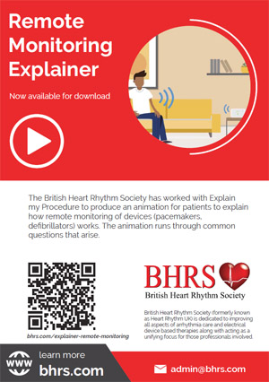 The British Heart Rhythm Society has worked with Explain my Procedure to produce an animation for patients to explain how remote monitoring of devices (pacemakers, defibrillators) works. The animation runs through common questions that arise. Please access via the link below.  The video is available in a range of different languages.  Please ensure you select your language first.