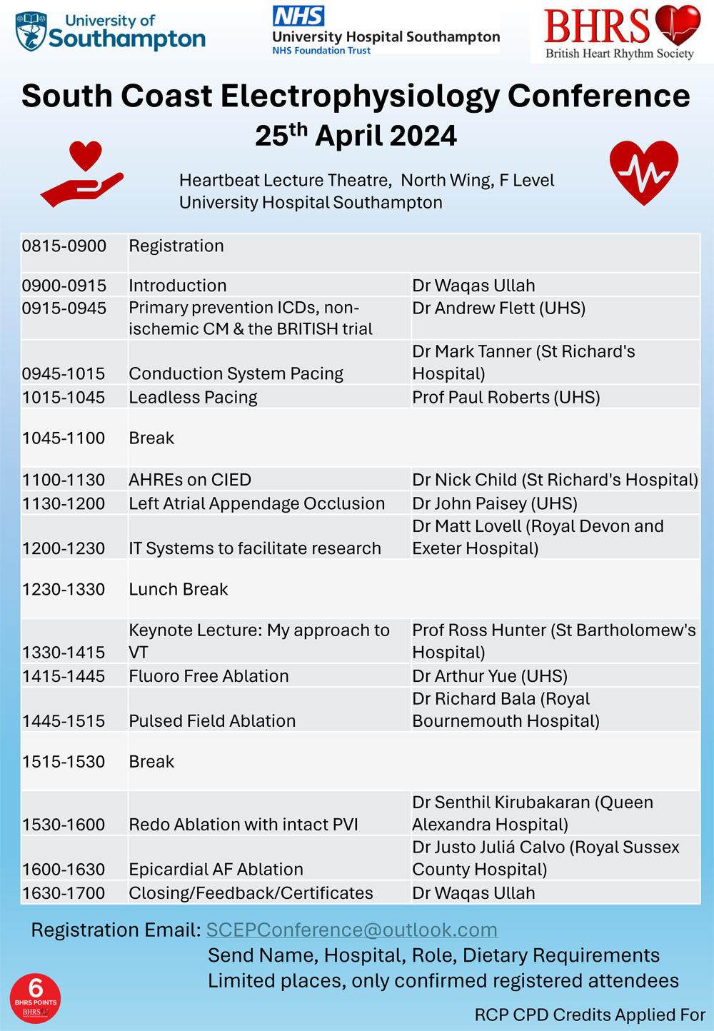 The conference will be held at University Hospital Southampton and will be targeted to Consultant Cardiac Electrophysiologists as well EP Fellows and Registrars, GPs with a special interest in cardiac rhythm management, cardiac physiologists and specialist arrhythmia nurses.