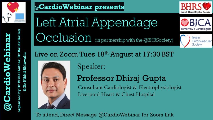 Professor Dhiraj Gupta will be discussing Left Atrial Appendage Occlusion on Tues 18th Aug, 5:30pm UK.